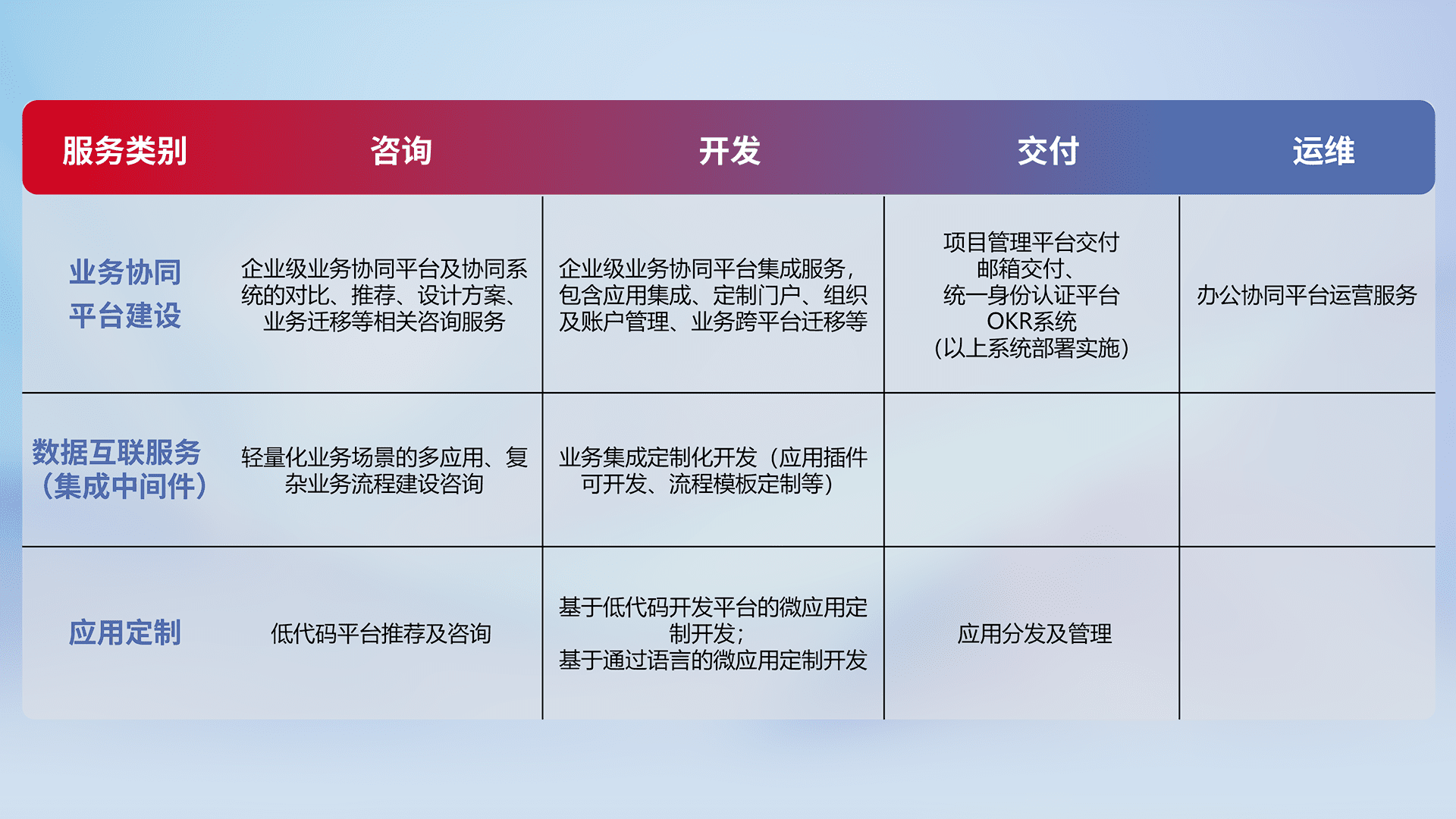 针对钉钉、、企微、、、IDaas等平台级产品提供产品的规划、、方案、、交付、、、、定制化开发等服务,,实现如统一协同办公、、、智能客户服务、、混合会议管理、、、智能数据查询、、、等业务场景,,实现数字化转型。。